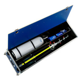 Für die Energieversorgung ist ein integriertes Ladegerät mit 2 m Ladekabel (12/24 V, Zigarettenanzünder) verbaut. Die Elektronik überwacht Akkutemperatur und Fahrzeugbatterie; ein Tiefentladeschutz unterbricht den Ladevorgang automatisch und startet ihn bei Überschreiten des Grenzwerts bzw. beim Motorstart erneut. Das robuste Gehäuse verfügt über integrierte, ausklappbare Standfüße – für sicheren Stand und schnellen Einsatz vor Ort.