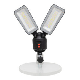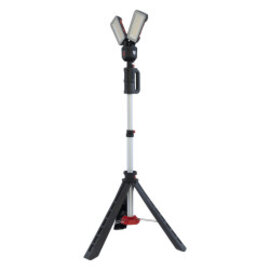 Die kompakte LED-Arbeitsleuchte mit Dreifuß liefert mobiles Licht genau dort, wo es gebraucht wird. Die beiden Leuchtenköpfe sind um 90° neig- und bis 330° drehbar – für punktgenaues Spot- oder flächiges Arbeitslicht. Vier Helligkeitsstufen (100 / 40 / 20 / 10 %) und eine Kapazitätsanzeige sorgen für kontrollierten Betrieb; der Akku ist in ca. 5 h wieder voll geladen. Für den Transport lässt sich das System komplett zusammenklappen und ist im Handumdrehen einsatzbereit.