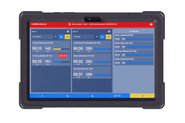 - Atemschutz- und Ressourcenstatus: aktueller Flaschendruck, verbleibende Einsatzzeit, berechnete Rückzugszeit
