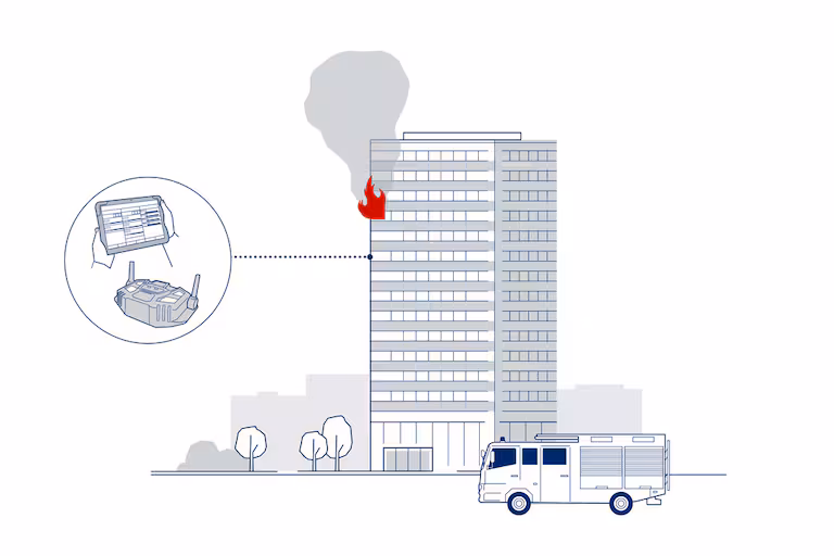 Die Funkreichweite der Atemschutzüberwachung variiert je nach Art und Bauweise der Anlage bzw. des Gebäudes (z. B. Lagerhalle oder Tunnel). Bei komplexen Strukturen, langen Distanzen oder Höhenunterschieden erweitert der Dräger FireGround Repeater die Verbindung zwischen dem Dräger PSS® AirBoss Connect und dem Dräger FireGround Hub.